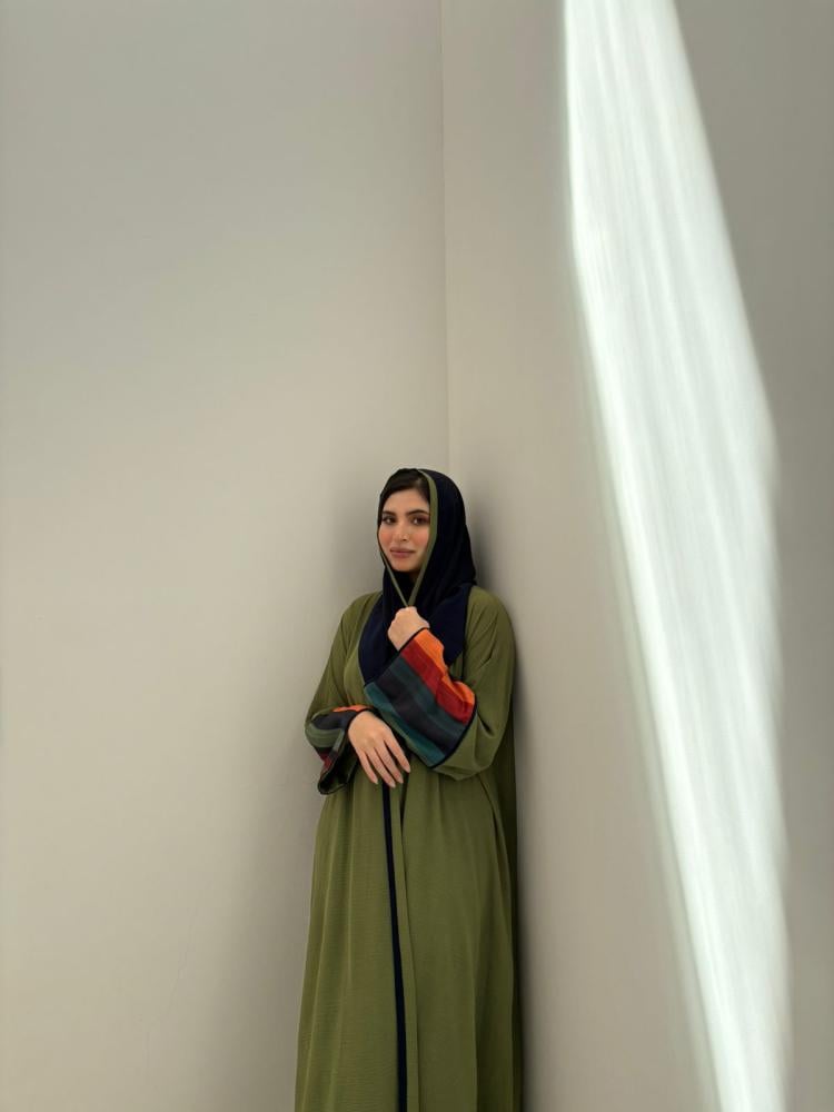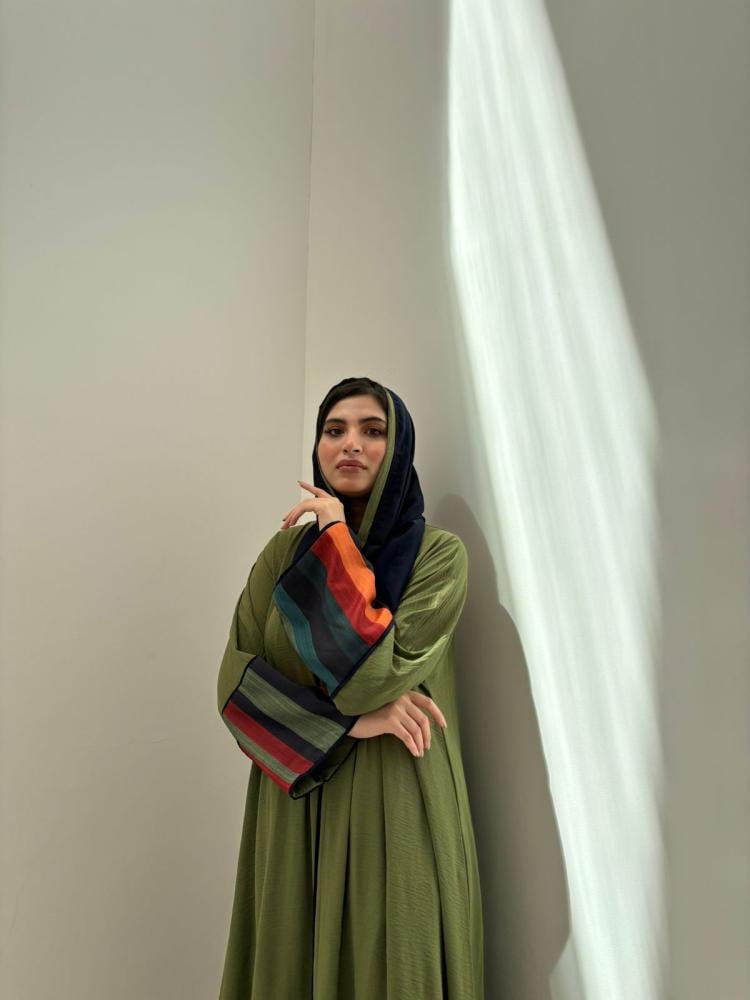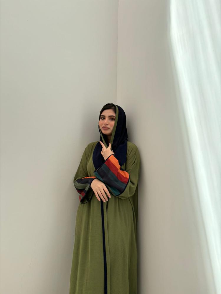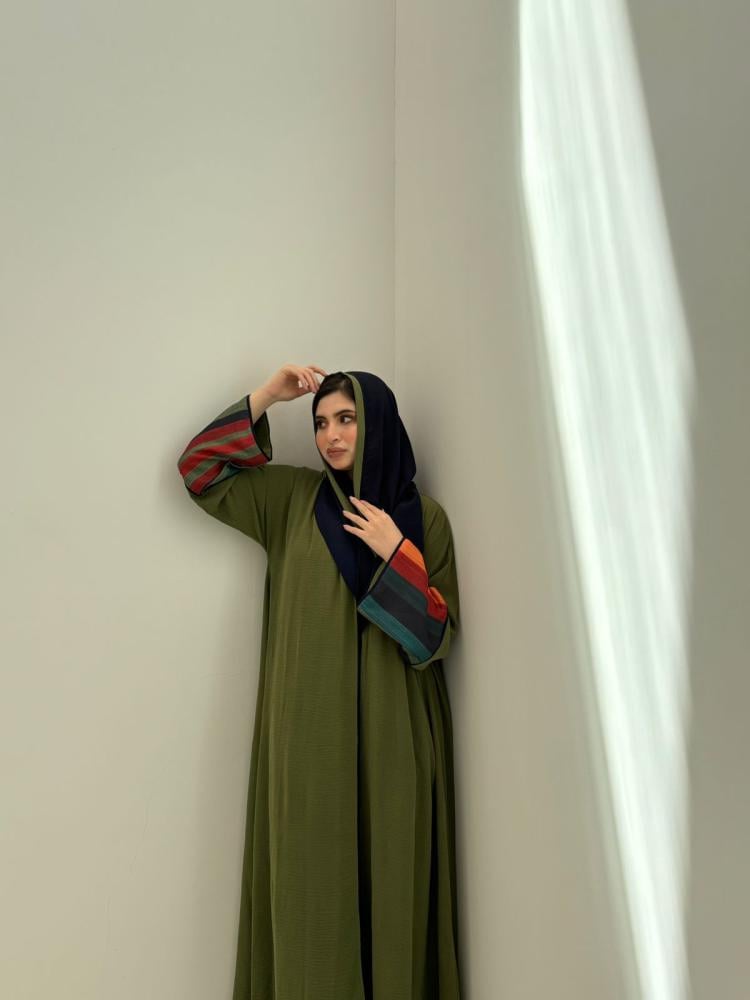 - عباية زيتي بأكمام مزينة بخطوط ملونة تضيف لمسة مميزة ومبهجة لأسلوبك.