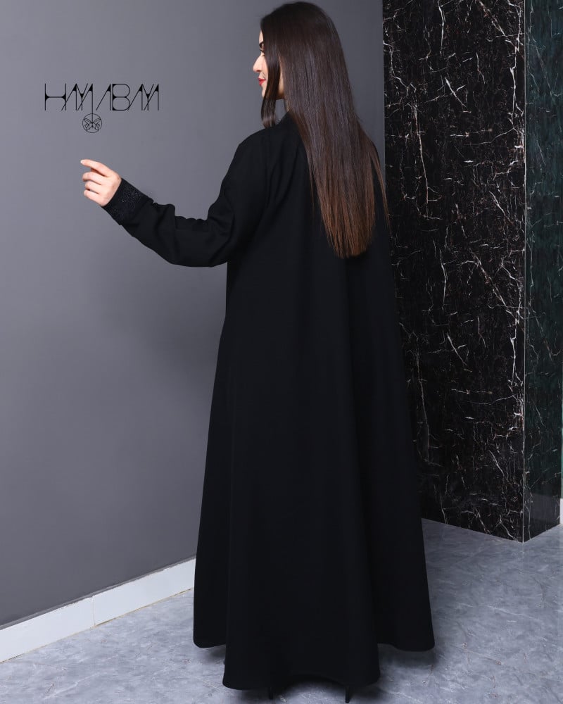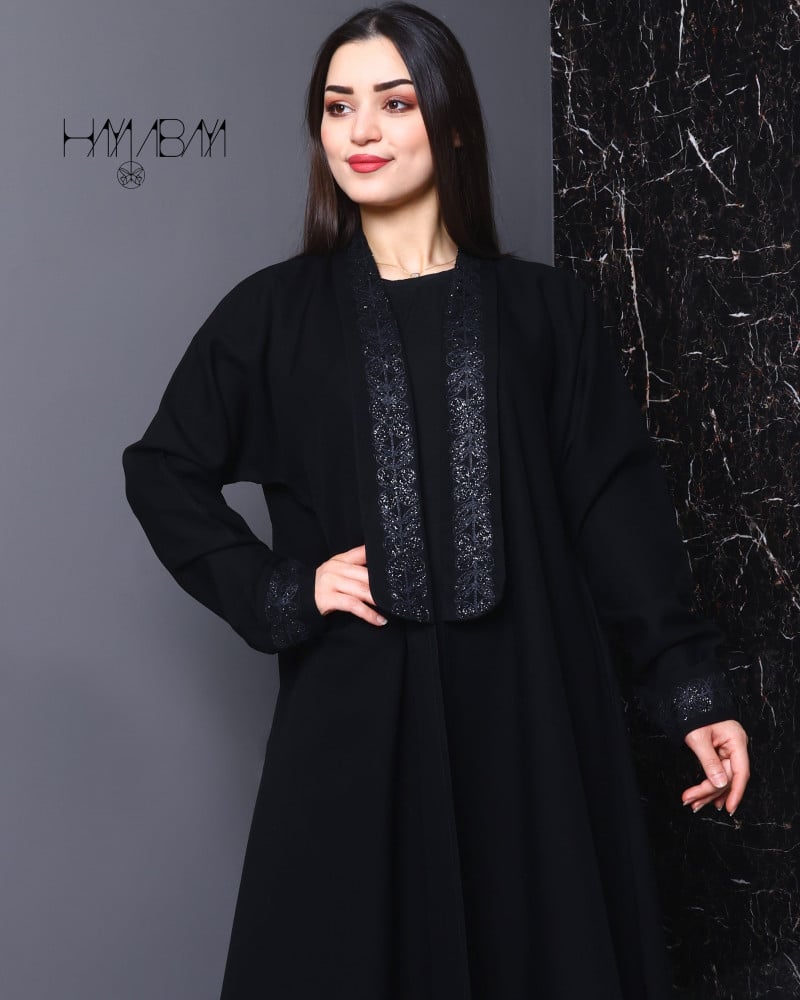عباية قصة كلوش نوع القماش كريب مع قصة بليزر واضافة قماش الياقة بقماش الترتر