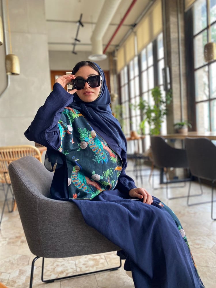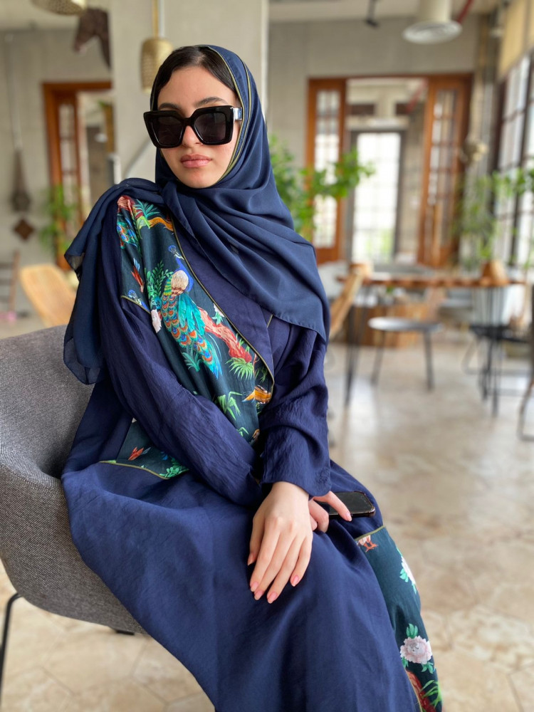 عباية كحلي فاتح من هيا عباية، قطعة فاخرة بلون ملكي مع تفاصيل طباعية مستوحاة من الطبيعة الساحرة، تمنحك إطلالة جذابة بكل أناقة ورقي.
