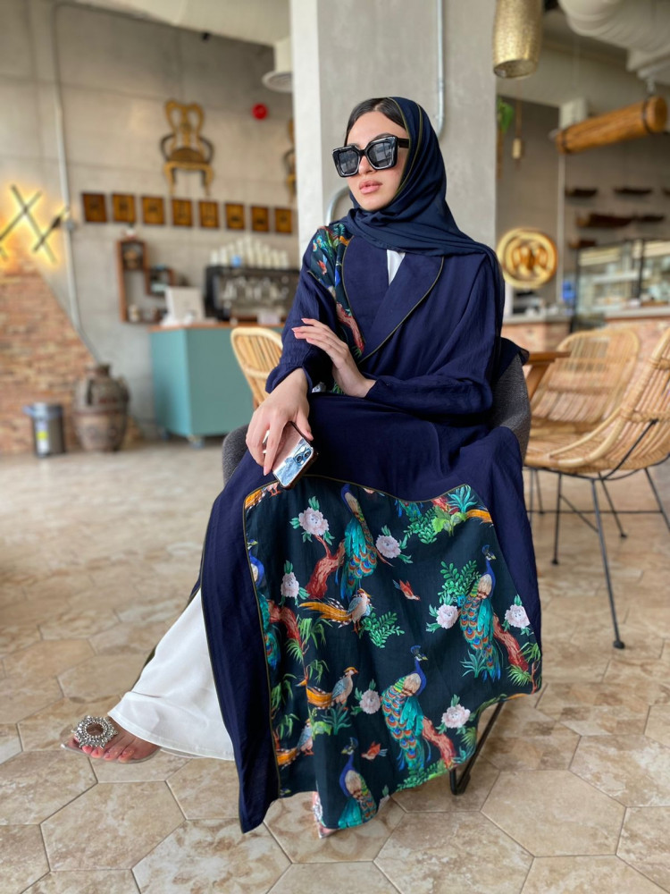 • عباية كحلي فاتح بطبعة طاووس فنية تضيف لمسة من الفخامة.