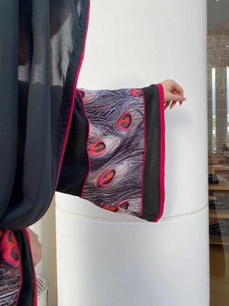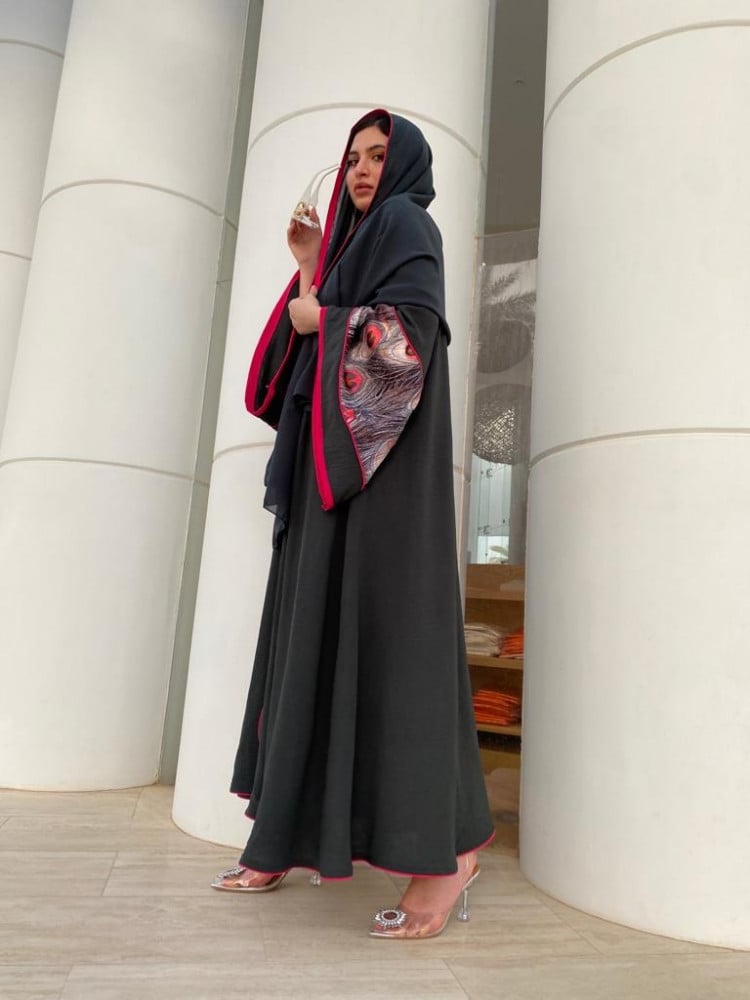 تألقي بـ عبايه رمادي غامق كلوش بلمسة فنية على الأكمام والأطراف. تصميمها الفضفاض والمريح يجعلها الخيار المثالي لكل من تبحث عن الأناقة مع الراحة، مع لمسات حمراء أنيقة تضيف لمسة من الجرأة والرقي.
