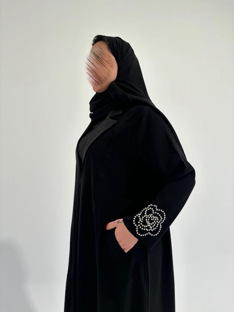 - خامة متينة وعملية: مصنوعة من قماش كريب فاخر مقاوم للتجاعيد وسهل العناية، ليبقى مظهر العباية أنيق مع الاستخدام المستمر.